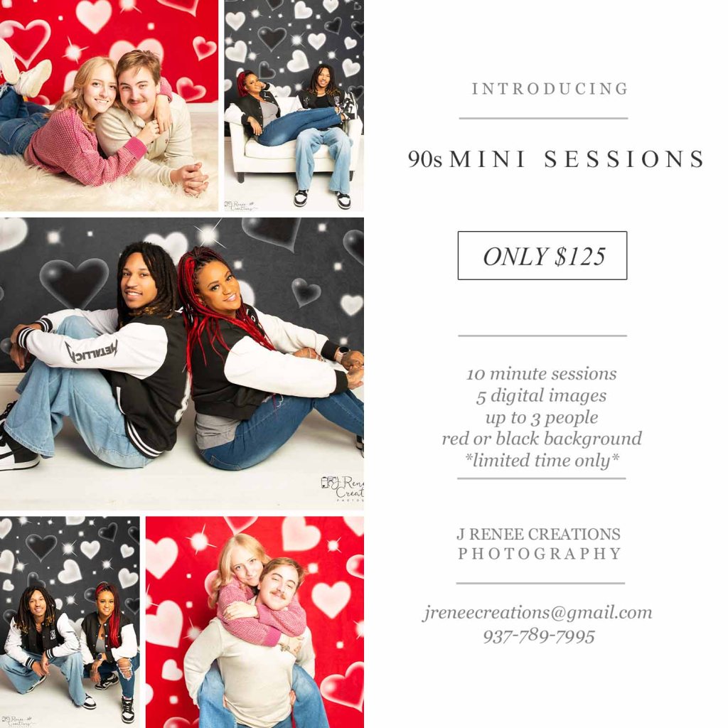 The second: 90s Minis. The 90s were a fun time, full of love and great music! These sessions would be great for couples, siblings, or parents with their kids. You have your choice of the red or black heart background, and they come with 5 digital images.