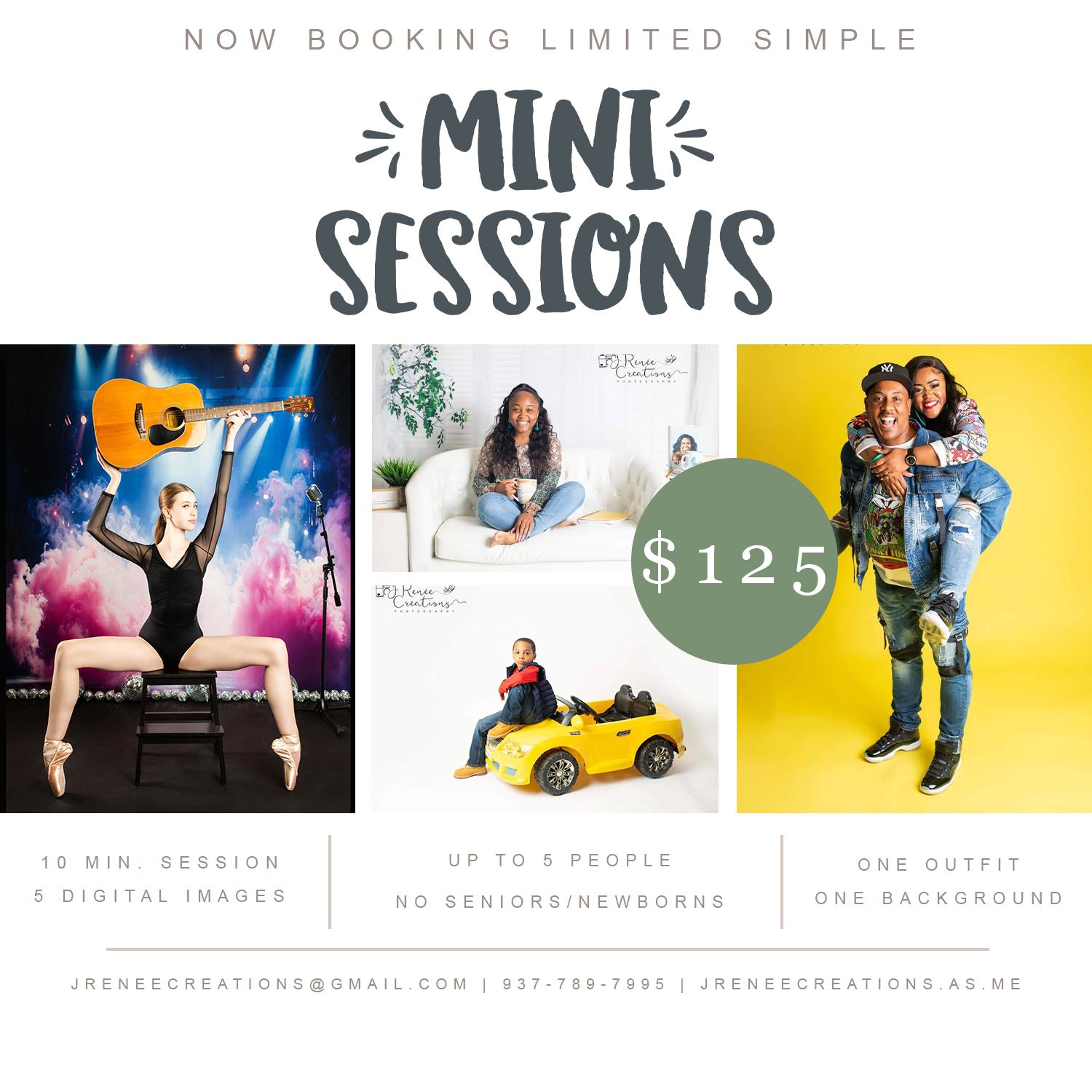 These are good for families, children, birthdays, etc! For only $125, you get a 10-minute session, one outfit, 1-2 backgrounds, and 5 digital images. These can only be used for families of up to 5 people, and no seniors or newborns.